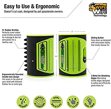 Ontworpen om losse haren uti de boven- en ondervacht van uw hond te kammen. Dat betekent geen bolletjes haar meer overal. Veeg het verzamelde haar na gebruik weg.