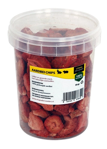 De Utopia Aarbei Chips 50 gr zijn gezonde snacks voor jouw konijn of knager, 100% natuurlijk en zeer smaakvol. Fruit maakt een belangrijk deel uit van het dieet van konijnen en knaagdieren. Verwen jouw dier daarom nu met deze heerlijke gedroogde fruitsnack van Utopia! Deze lekkere gedroogde aardbeienschijfjes zijn heerlijk geurend en smaakvol en gemaakt zonder kunstmatige toevoegingen. Puur fruit dus, geheel natuurlijk! De zoete smaak van de aardbei zal ervoor zorgen dat dit al gauw het favoriete tussendoortje van jouw dier zal zijn. Geef het jouw dier als beloning, als verrassing tussen het hooi of gewoon door het dagelijkse voer!