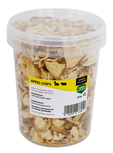 De Utopia Appel Chips 80 gr zijn gezonde snacks voor jouw konijn of knager, 100% natuurlijk en zeer smaakvol. Fruit maakt een belangrijk deel uit van het dieet van konijnen en knaagdieren. Verwen jouw dier daarom nu met deze heerlijke gedroogde fruitsnack van Utopia! Deze lekkere gedroogde appelschijfjes zijn heerlijk geurend en smaakvol en gemaakt zonder kunstmatige toevoegingen. Puur fruit dus, geheel natuurlijk! De zoete smaak van de appel zal ervoor zorgen dat dit al gauw het favoriete tussendoortje van jouw dier zal zijn. Geef het jouw dier als beloning, als verrassing tussen het hooi of gewoon door het dagelijkse voer!