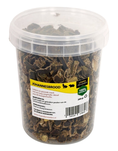 De Utopia Johannesbrood 200 gr is een gezonde snack voor jouw konijn of knager, 100% natuurlijk en zeer smaakvol. Fruit en groenten maken een belangrijk deel uit van het dieet van konijnen en knaagdieren. Verwen jouw dier daarom nu met dit heerlijke johannesbrood van Utopia! Deze lekkere gedroogde peulen van de johannesbroodboom zijn heerlijk smaakvol en gemaakt zonder kunstmatige toevoegingen. Puur natuurlijk dus! De unieke smaak van johannesbrood zal ervoor zorgen dat dit al gauw het favoriete tussendoortje van jouw dier zal zijn. Geef het jouw dier als beloning, als verrassing tussen het hooi of gewoon door het dagelijkse voer!