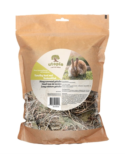 Het Utopia Timothy Hooi Met Berkenblad 450 gr is een aanvullende diervoeding voor konijnen en knaagdieren met een hoog ruwvezelgehalte. Timothy Hooi is een gezonde en lekkere hooisoort voor konijnen en knaagdieren. Dit hooi heeft een hoog ruwvezelgehalte en is goed voor de tanden en spijsvertering. Daarnaast heeft het een gunstige calcium/fosfor verhouding. Timothy Hooi is een zeer smakelijk hooi wat goed gegeten wordt. Het toegevoegde berkenblad bevat veel ruwe vezels en vitamine C. Daarnaast het een positieve uitwerking op de nierfunctie. Dit hooi is 100% natuurlijk, zonder suiker, smaakversterkers, additieven, kleurstoffen en conserveringsmiddelen.